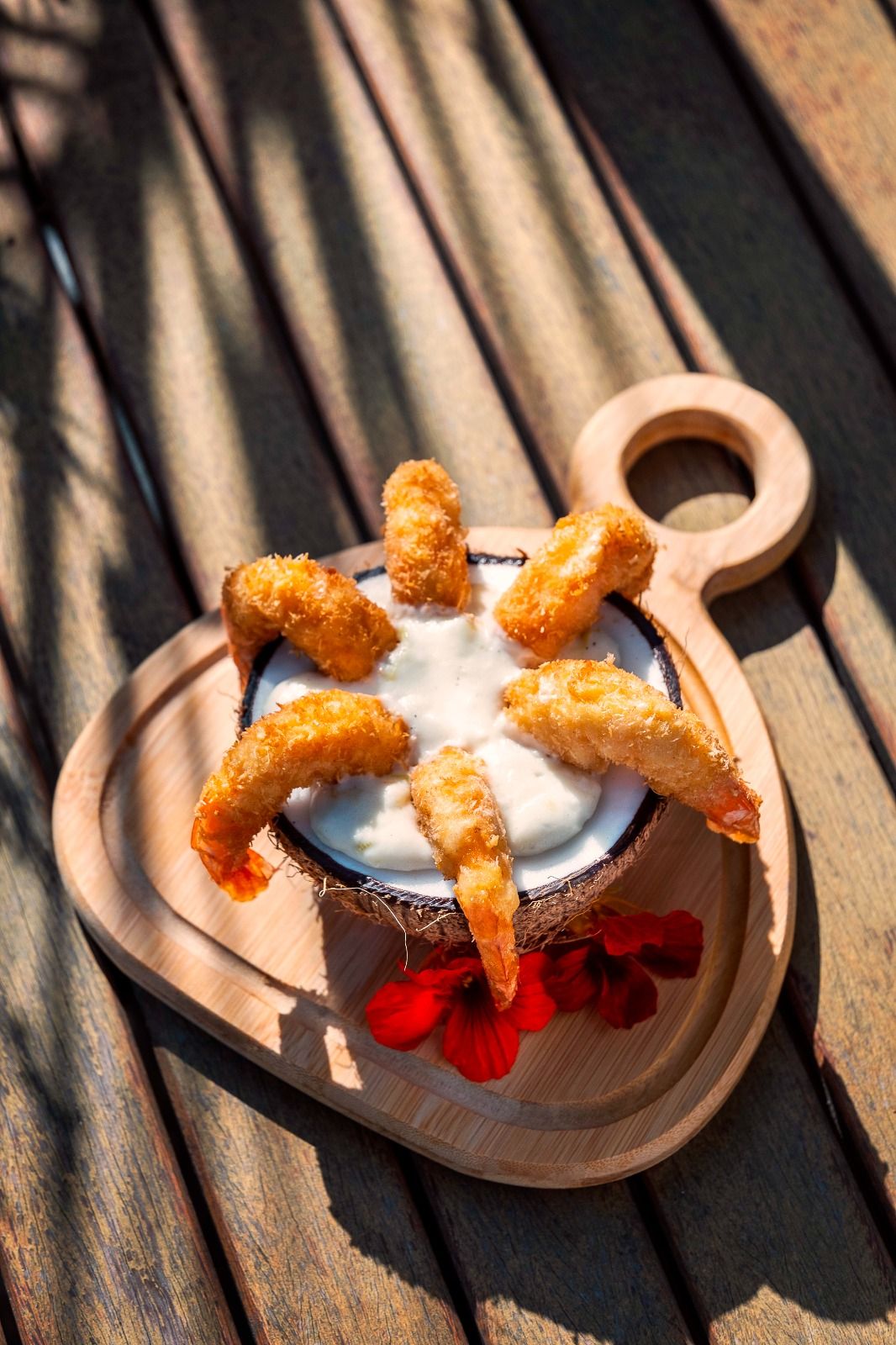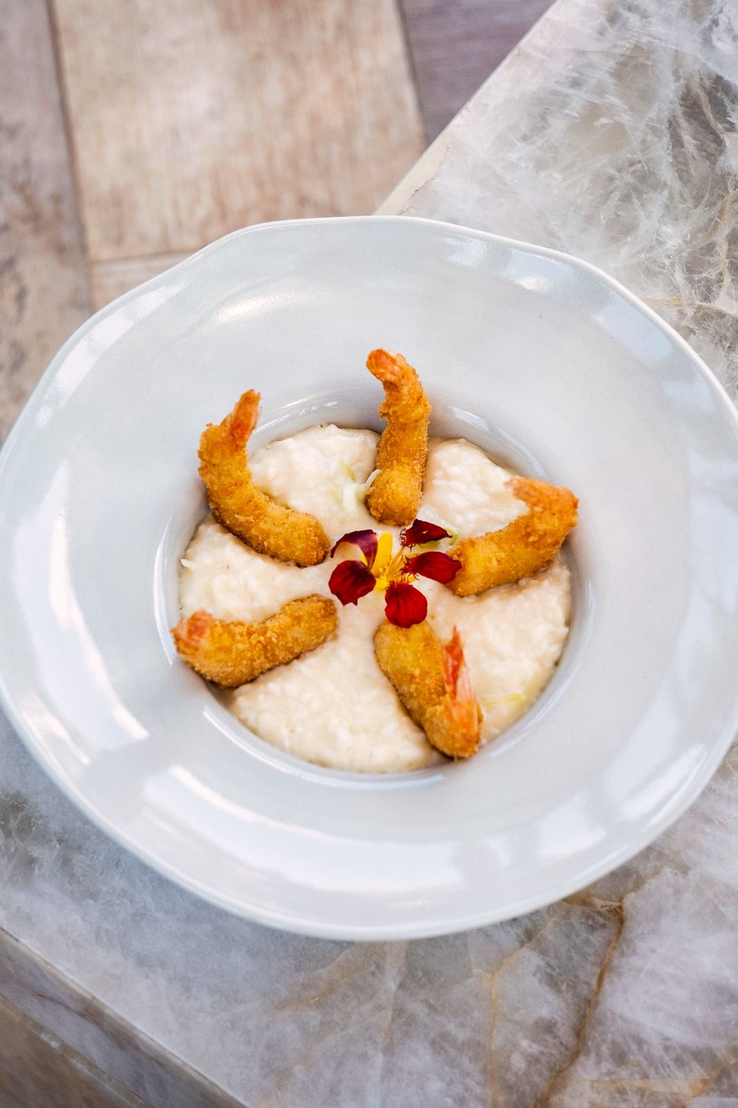 Camarão Empanado acompanhado de Risoto de Alho-Poró