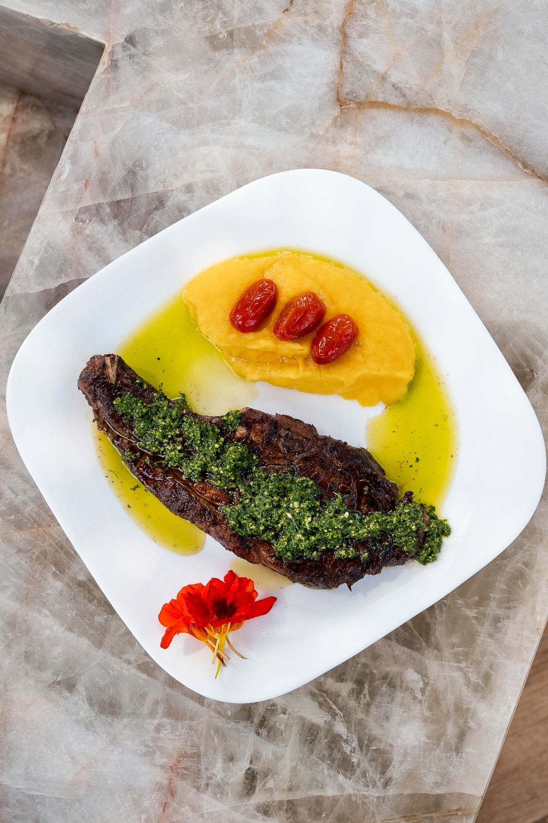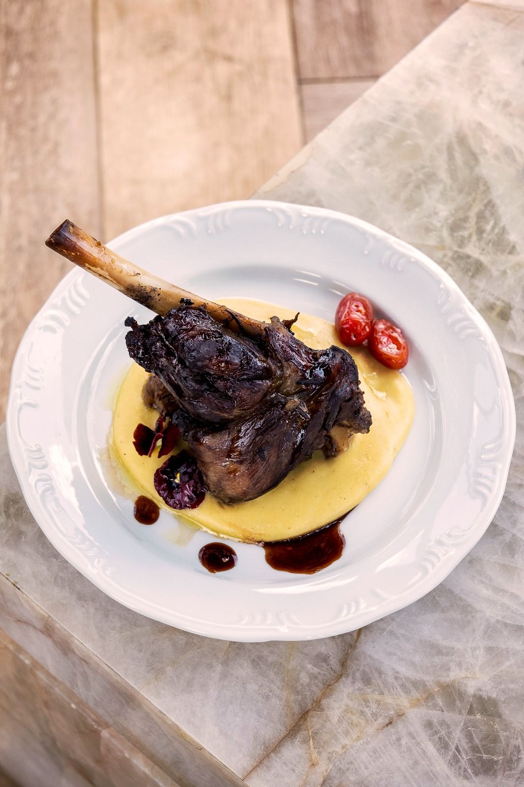 Stinco de Cordeiro ao Molho Pesto de Ervas acompanhado de Purê de Mandioquinha e Tomate Defumado.