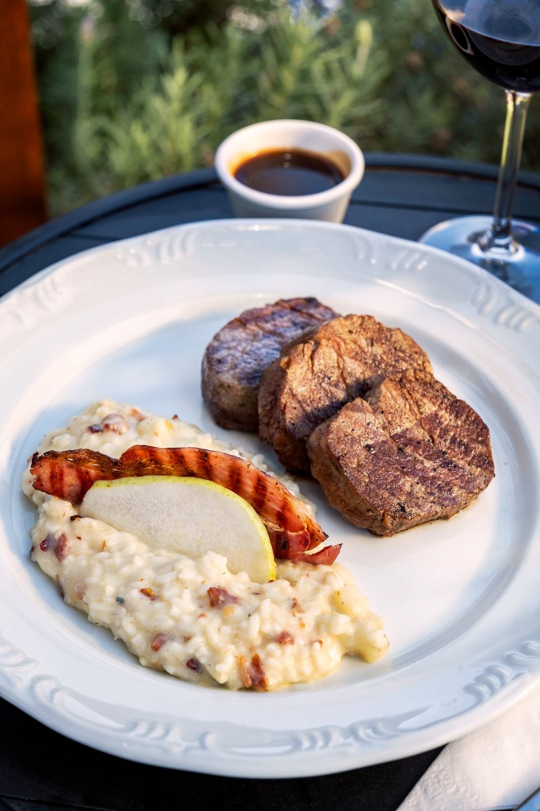 Filé Mignon ao Molho Roti acompanha Risoto de Gorgonzola, Bacon e Pera.