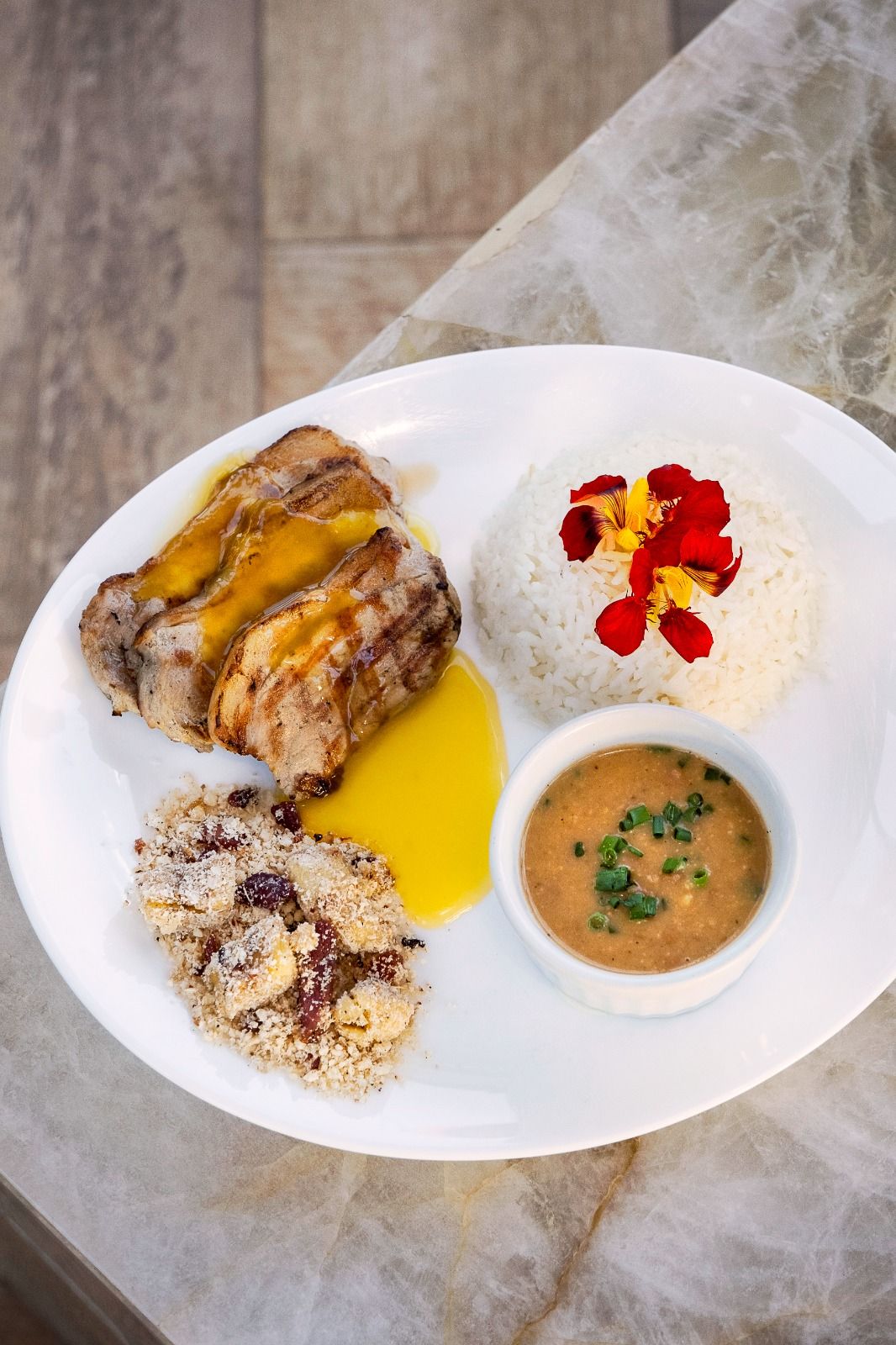 Picanha Suína ao Molho de Laranja acompanhada de Arroz Branco, Tutu de Feijão e Farofa de Banana.