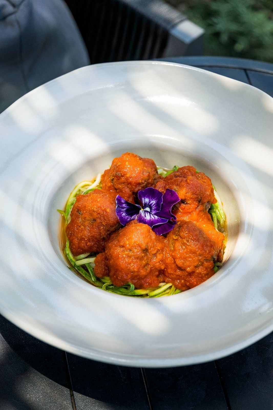 Almôndega de Proteína de Soja ao Molho Sugo Acompanhada de Espaguete de Abobrinha.
