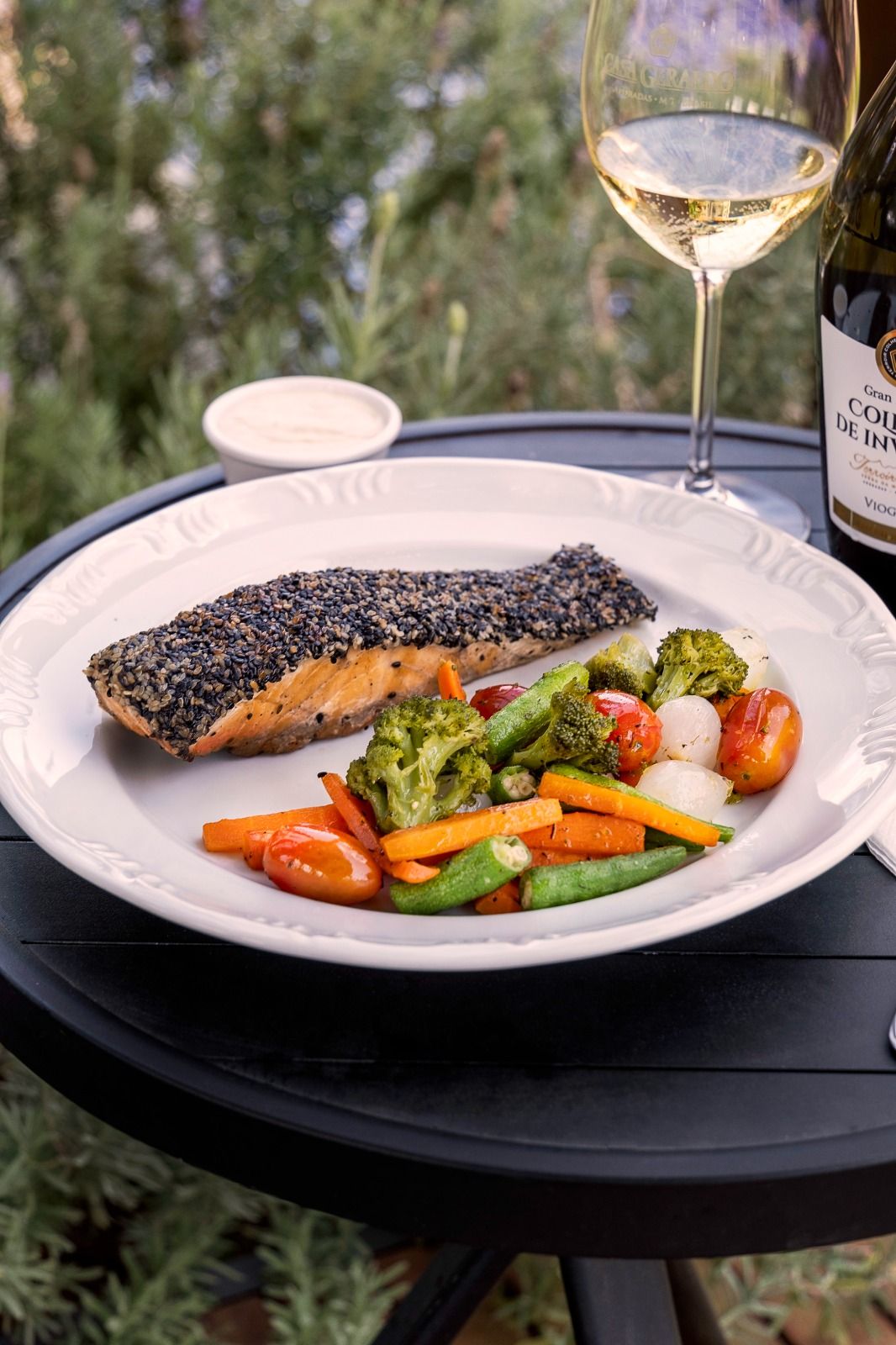 Salmão Grelhado com Crosta de Gergelim ao Molho de Alho-Poró e Legumes Salteados.